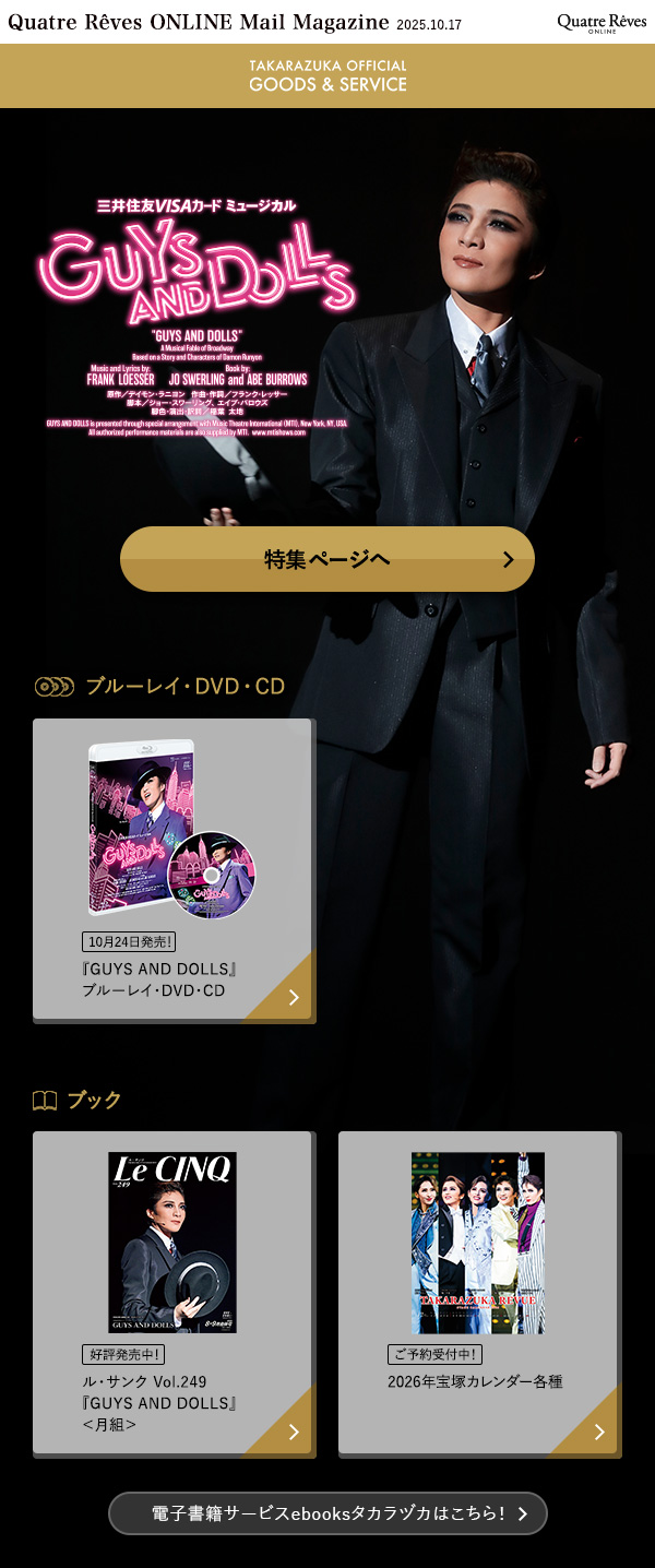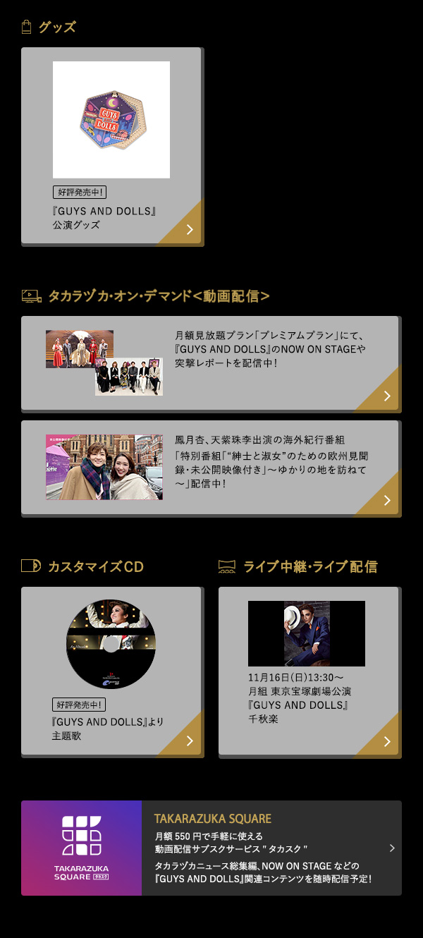 OFFICIAL GOODS & SERVICE 月組『GUYS AND DOLLS』特集ページへ ブルーレイ・DVD・CD 10月24日発売!『GUYS AND DOLLS』ブルーレイ・DVD・CD ブック 好評発売中!ル・サンク Vol.249『GUYS AND DOLLS』<月組> ご予約受付中!2026年宝塚カレンダー各種 電子書籍サービスebooksタカラヅカはこちら! グッズ 好評発売中!『GUYS AND DOLLS』公演グッズ タカラヅカ・オン・デマンド<動画配信> 月額見放題プラン「プレミアムプラン」にて、『GUYS AND DOLLS』のNOW ON STAGEや突撃レポートを配信中! 鳳月杏、天紫珠李出演の海外紀行番組「特別番組「“紳士と淑女”のための欧州見聞録・未公開映像付き」〜ゆかりの地を訪ねて〜」配信中! カスタマイズCD 『GUYS AND DOLLS』より主題歌 ライブ中継・ライブ配信 11月16日(日)13:30〜月組 東京宝塚劇場公演『GUYS AND DOLLS』千秋楽 月額550円で手軽に使える動画配信サブスクサービス”タカスク”タカラヅカニュース総集編、NOW ON STAGEなどの『GUYS AND DOLLS』関連コンテンツを随時配信予定!