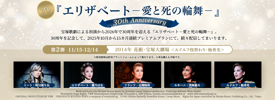 ▽『愛の不時着』原作tvNドラマ「愛の不時着」パク・ジウン執筆 ⓒSTUDIO DRAGON by CJ ENM, ALL RIGHTS RESERVED. Writer : Park Ji eun ▽『アレクサンダー』原作/赤石 路代「アレクサンダー大王 -天上の王国-」(小学館「flowersフラワーコミックスα」刊) ▽『PRINCE OF LEGEND』原作・著作・構想/HI-AX ▽『An American in Paris』Music and Lyrics by George Gershwin and Ira Gershwin Book by Craig Lucas Originally produced on Broadway by Stuart Oken Van Kaplan Roy Furman By special arrangement with Elephant Eye Theatrical & Pittsburgh CLO and Théâtre du Châtelet The worldwide copyright in the music of George and Ira Gershwin for this presentation are licensed by the Gershwin Family An American in Paris is presented by arrangement with Concord Theatricals on behalf of TAMS WITMARK LLC and BROADWAY ASIA www.concordtheatricals.com and www.broadwayasia.com ▽『悪魔城ドラキュラ』原作/株式会社コナミデジタルエンタテインメント 「悪魔城ドラキュラ」シリーズ ▽『ZORRO THE MUSICAL』“Zorro - The Musical” is presented in association with Zorro USA LLC Original Executive Producer - John Gertz ▽『記憶にございません!』原作/映画「記憶にございません!」 ©2019フジテレビ 東宝 映画脚本・監督/三谷 幸喜 ▽『阿修羅城の瞳』原作/劇団☆新感線「阿修羅城の瞳」(作・中島 かずき) 原作演出/いのうえひでのり ▽『ANTHEM-アンセム-』総合演出・ステージ制作/大田 高彰(インターグルーヴプロダクションズ) ▽『BONNIE & CLYDE』Book by IVAN MENCHELL Lyrics by DON BLACK Music by FRANK WILDHORN BONNIE & CLYDE is presented through special arrangement with Music Theatre International (MTI). All authorized performance materials are also supplied by MTI. 423 West 55th Street, 2nd Floor, New York, New York 10019 USA www.mtishows.com ▽『Thunderbolt Fantasy 東離劍遊紀』~虚淵玄 原案・脚本・総監修「Thunderbolt Fantasy 東離劍遊紀」より~ (c)2016-2018 Thunderbolt Fantasy Project ▽『愛と革命の詩-アンドレア・シェニエ-』~オペラ「アンドレア・シェニエ」より~ ▽『はいからさんが通る』原作/大和 和紀「はいからさんが通る」(講談社KCDXデザート) (c)大和 和紀/講談社 ▽『天は赤い河のほとり』原作/篠原 千絵「天は赤い河のほとり」(小学館) ▽『ヴェネチアの紋章』原作/塩野 七生『小説イタリア・ルネサンス1 ヴェネツィア』(新潮文庫刊) ▽『記憶にございません!』原作/映画「記憶にございません!」 ©2019フジテレビ 東宝 映画脚本・監督/三谷 幸喜 ▽『DEATH TAKES A HOLIDAY』Book by Thomas Meehan and Peter Stone / Music and Lyrics by Maury Yeston Based on the dramatic play by Alberto Casella and rewritten for the American stage by Walter Ferris and originally produced by the Messrs. Shubert ▽『ディミトリ~曙光に散る、紫の花~』─並木陽作「斜陽の国のルスダン」より─ ▽『RRR × TAKA"R"AZUKA ~√Bheem~』Based on SS Rajamouli’s ‘RRR’. ▽『ブラック・ジャック 危険な賭け』─手塚治虫原作「ブラック・ジャック」より─ ▽『ME AND MY GIRL』Book and Lyrics by L.ARTHUR ROSE and DOUGLAS FURBER Music by NOEL GAY Book revised by STEPHEN FRY Contributions to revisions by MIKE OCKRENT ▽『愛するには短すぎる』原案/小林 公平 ▽『パルムの僧院 —美しき愛の囚人—』~スタンダール作『パルムの僧院』より~ ▽『Xcalibur エクスカリバー』Book by Ivan Menchell Music by Frank Wildhorn Lyrics by Robin Lerner Original Music Arrangement and Orchestration by Koen Schoots Original Production & Worldwide Stage Rights and Management by EMK MUSICAL COMPANY KOREA ▽『応天の門』原作/灰原 薬「応天の門」(新潮社バンチコミックス刊) ▽『群盗-Die Rauber-』-フリードリッヒ・フォン・シラー作「群盗」より- ▽『1789 -バスティーユの恋人たち-』Le Spectacle Musical ≪1789 - Les Amants de la Bastille≫ Produced by NTCA PRODUCTIONS, Dove Attia and Albert Cohen International Licensing & Booking, G.L.O, Guillaume Lagorce ▽『鴛鴦歌合戦』~原作 映画「鴛鴦歌合戦」(c)日活株式会社 監督/マキノ正博 脚本/江戸川浩二~ ▽『ドン・ジュアン』«DON JUAN» un Spectacle Musical de FELIX GRAY International Licensing & Booking of «Don Juan» NDP Project ▽『Le Rouge et le Noir ~赤と黒~』D'après l'œuvre de Stendhal «Le Rouge et le Noir, l'Opéra Rock» Produced by Sam Smadja - SB Productions International Licensing & Booking, G.L.O, Guillaume Lagorce ▽『銀ちゃんの恋』-つかこうへい作「蒲田行進曲」より- ▽『カジノ・ロワイヤル ~我が名はボンド~』原作/イアン・フレミング「007/カジノ・ロワイヤル」(白石朗訳、創元推理文庫刊) ▽『FLY WITH ME』Produced by TEAM GENESIS from LDH JAPAN ▽『蒼穹の昴』~浅田次郎作「蒼穹の昴」(講談社文庫)より~ ▽『HiGH&LOW -THE PREQUEL-』原作・著作・構想/HI-AX ▽『夢介千両みやげ』原作/山手 樹一郎「夢介千両みやげ」 ▽『王家に捧ぐ歌』-オペラ「アイーダ」より- ▽『今夜、ロマンス劇場で』原作/映画「今夜、ロマンス劇場で」(c)2018 フジテレビジョン ホリプロ 電通 KDDI ▽『川霧の橋』-山本周五郎作「柳橋物語」「ひとでなし」より- ▽『柳生忍法帖』原作/山田 風太郎「柳生忍法帖」(KADOKAWA 角川文庫刊) ▽『CITY HUNTER』(C)北条 司/コアミックス 1985 ▽『ヴェネチアの紋章』原作/塩野 七生『小説イタリア・ルネサンス1 ヴェネツィア』(新潮文庫刊) ▽『ダル・レークの恋』作/菊田 一夫 ▽『ロミオとジュ
